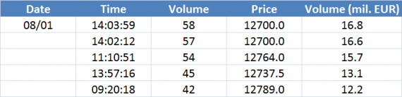Největší obchody podle objemu na DAX (aktivní future kontrakt)