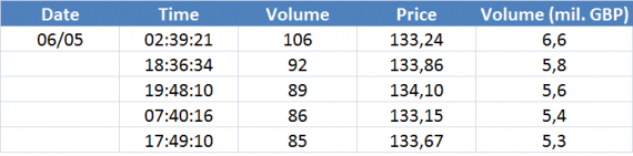 Největší obchody podle objemu na GBPUSD (aktivní future kontrakt):