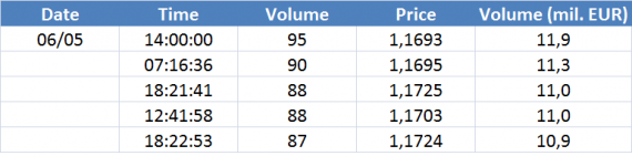 Největší obchody podle objemu na EURUSD (aktivní future kontrakt):