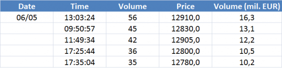 Největší obchody podle objemu na DAX (aktivní future kontrakt)