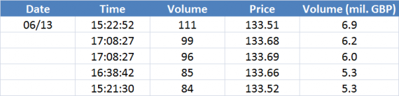 Největší obchody podle objemu na GBPUSD (aktivní future kontrakt):