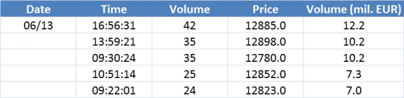Největší obchody podle objemu na DAX (aktivní future kontrakt)