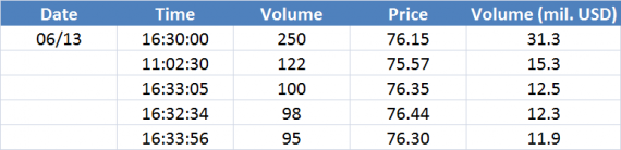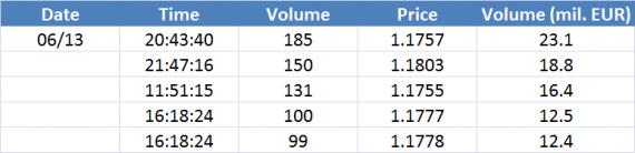 Největší obchody podle objemu na EURUSD (aktivní future kontrakt):