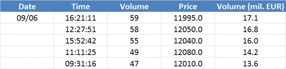 Největší obchody podle objemu na EURUSD (aktivní future kontrakt):