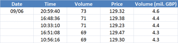Největší obchody podle objemu na GBPUSD (aktivní future kontrakt):