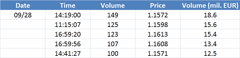 Největší obchody podle objemu na EURUSD (aktivní future kontrakt):