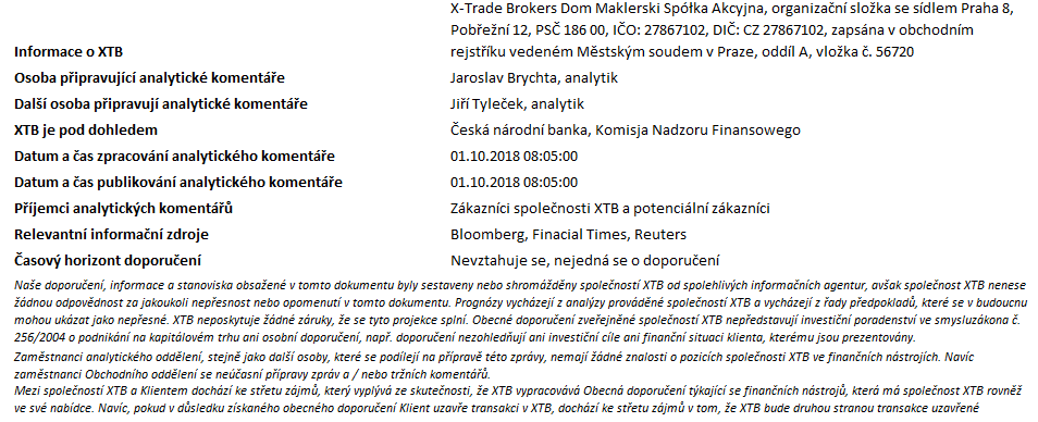 Rozdílové smlouvy jsou komplexní nástroje a v důsledku použití finanční páky jsou spojeny s vysokým rizikem rychlého vzniku finanční ztráty. U 71 % účtů retailových investorů došlo při obchodování s rozdílovými smlouvami u tohoto poskytovatele ke vzniku ztráty. Měli byste zvážit, zda rozumíte tomu, jak rozdílové smlouvy fungují, a zda si můžete dovolit vysoké riziko ztráty svých finančních prostředků. Investování je rizikové. Investujte zodpovědně. Tento materiál je marketingovou komunikací ve smyslu čl. 24 odst. 3 směrnice Evropského parlamentu a Rady 2014/65/EU ze dne 15. května 2014 o trzích finančních nástrojů, kterou se mění směrnice 2002/92/ES a směrnice 2011/61/EU (MiFID II). Marketingová komunikace není investiční doporučení ani informace doporučující či navrhující investiční strategii ve smyslu nařízení Evropského parlamentu a Rady (EU) č. 596/2014 ze dne 16. dubna 2014 o zneužívání trhu (nařízení o zneužívání trhu) a o zrušení směrnice Evropského parlamentu a Rady 2003/6/ES a směrnic Komise 2003/124/ES, 2003/125/ES a 2004/72/ES a nařízení Komise v přenesené pravomoci (EU) 2016/958 ze dne 9. března 2016, kterým se doplňuje nařízení Evropského parlamentu a Rady (EU) č. 596/2014, pokud jde o regulační technické normy pro technická ujednání pro objektivní předkládání investičních doporučení nebo jiných informací doporučujících nebo navrhujících investiční strategie a pro zveřejnění konkrétních zájmů nebo náznaků střetu zájmů nebo jakékoli jiné rady, a to i v oblasti investičního poradenství, ve smyslu zákona č. 256/2004 Sb., o podnikání na kapitálovém trhu. Marketingová komunikace je připravena s nejvyšší pečlivostí, objektivitou, prezentuje fakta známé autorovi k datu přípravy a neobsahuje žádné hodnotící prvky. Marketingová komunikace je připravena bez zohlednění potřeb klienta, jeho individuální finanční situace a nijak nepředstavuje investiční strategii. Marketingová komunikace nepředstavuje nabídku k prodeji, nabídku, předplatné, výzvu na nákup, reklamu nebo propagaci jakýchkoliv finančních nástrojů. Společnost XTB S.A., organizační složka nenese odpovědnost za jakékoli jednání nebo opomenutí klienta, zejména za získání nebo zcizení finančních nástrojů, na základě informací obsažených v této marketingové komunikaci. V případě, že marketingová komunikace obsahuje jakékoli informace o jakýchkoli výsledcích týkajících se finančních nástrojů v nich uvedených, nepředstavují žádnou záruku ani předpověď ohledně budoucích výsledků. Minulá výkonnost nemusí nutně vypovídat o budoucích výsledcích a každá osoba jednající na základě těchto informací tak činí zcela na vlastní riziko.