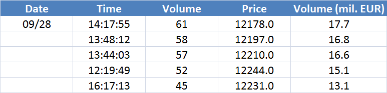 Největší obchody podle objemu na DAX (aktivní future kontrakt)