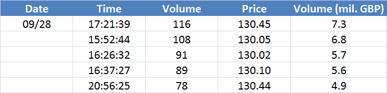 Největší obchody podle objemu na GBPUSD (aktivní future kontrakt):
