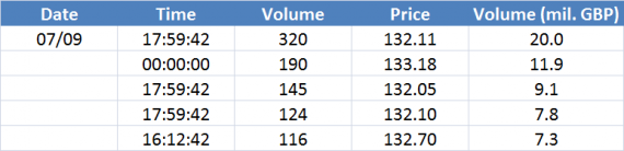 Největší obchody podle objemu na GBPUSD (aktivní future kontrakt):