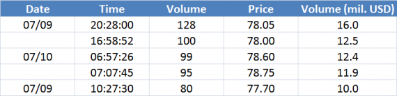 Největší obchody podle objemu na Brent (aktivní future kontrakt)