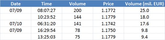 Největší obchody podle objemu na EURUSD (aktivní future kontrakt):