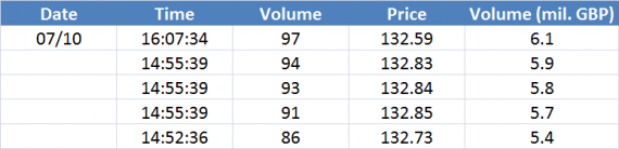 Největší obchody podle objemu na GBPUSD (aktivní future kontrakt):