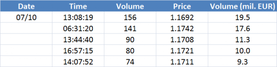 Největší obchody podle objemu na EURUSD (aktivní future kontrakt):