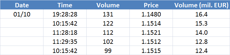 Největší obchody podle objemu na EURUSD (aktivní future kontrakt):