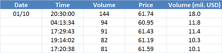Největší obchody podle objemu na Brent (aktivní future kontrakt)