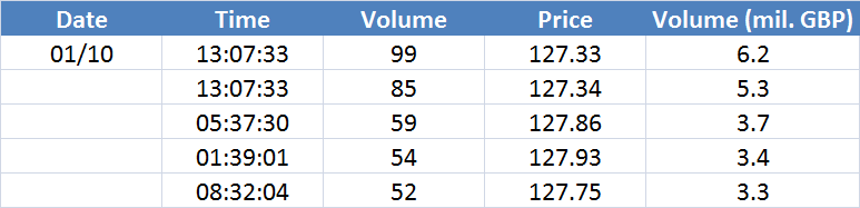 Největší obchody podle objemu na GBPUSD (aktivní future kontrakt): Největší denní objemy na trhu s měnovými futures. Na cenách, kde se včera objevily největší objemy, mohou být velcí hráči aktivní i dnes – zejména pokud se tyto ceny pohybují u některého ze včerejších high/low.