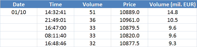 Největší obchody podle objemu na DAX (aktivní future kontrakt)