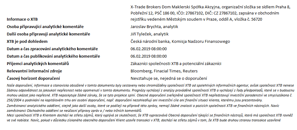 Rozdílové smlouvy jsou komplexní nástroje a v důsledku použití finanční páky jsou spojeny s vysokým rizikem rychlého vzniku finanční ztráty. U 75 % účtů retailových investorů došlo při obchodování s rozdílovými smlouvami u tohoto poskytovatele ke vzniku ztráty. Měli byste zvážit, zda rozumíte tomu, jak rozdílové smlouvy fungují, a zda si můžete dovolit vysoké riziko ztráty svých finančních prostředků. Investování je rizikové. Investujte zodpovědně. Tento materiál je marketingovou komunikací ve smyslu čl. 24 odst. 3 směrnice Evropského parlamentu a Rady 2014/65/EU ze dne 15. května 2014 o trzích finančních nástrojů, kterou se mění směrnice 2002/92/ES a směrnice 2011/61/EU (MiFID II). Marketingová komunikace není investiční doporučení ani informace doporučující či navrhující investiční strategii ve smyslu nařízení Evropského parlamentu a Rady (EU) č. 596/2014 ze dne 16. dubna 2014 o zneužívání trhu (nařízení o zneužívání trhu) a o zrušení směrnice Evropského parlamentu a Rady 2003/6/ES a směrnic Komise 2003/124/ES, 2003/125/ES a 2004/72/ES a nařízení Komise v přenesené pravomoci (EU) 2016/958 ze dne 9. března 2016, kterým se doplňuje nařízení Evropského parlamentu a Rady (EU) č. 596/2014, pokud jde o regulační technické normy pro technická ujednání pro objektivní předkládání investičních doporučení nebo jiných informací doporučujících nebo navrhujících investiční strategie a pro zveřejnění konkrétních zájmů nebo náznaků střetu zájmů nebo jakékoli jiné rady, a to i v oblasti investičního poradenství, ve smyslu zákona č. 256/2004 Sb., o podnikání na kapitálovém trhu. Marketingová komunikace je připravena s nejvyšší pečlivostí, objektivitou, prezentuje fakta známé autorovi k datu přípravy a neobsahuje žádné hodnotící prvky. Marketingová komunikace je připravena bez zohlednění potřeb klienta, jeho individuální finanční situace a nijak nepředstavuje investiční strategii. Marketingová komunikace nepředstavuje nabídku k prodeji, nabídku, předplatné, výzvu na nákup, reklamu nebo propagaci jakýchkoliv finančních nástrojů. Společnost XTB S.A., organizační složka nenese odpovědnost za jakékoli jednání nebo opomenutí klienta, zejména za získání nebo zcizení finančních nástrojů, na základě informací obsažených v této marketingové komunikaci. V případě, že marketingová komunikace obsahuje jakékoli informace o jakýchkoli výsledcích týkajících se finančních nástrojů v nich uvedených, nepředstavují žádnou záruku ani předpověď ohledně budoucích výsledků. Minulá výkonnost nemusí nutně vypovídat o budoucích výsledcích a každá osoba jednající na základě těchto informací tak činí zcela na vlastní riziko.