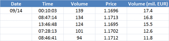 Největší obchody podle objemu na EURUSD (aktivní future kontrakt):