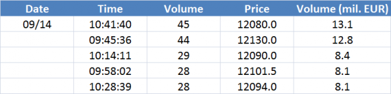 Největší obchody podle objemu na DAX (aktivní future kontrakt)