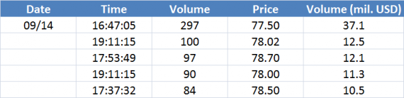 Největší obchody podle objemu na Brent (aktivní future kontrakt)