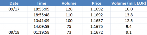 Největší obchody podle objemu na EURUSD (aktivní future kontrakt):