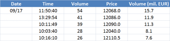 Největší obchody podle objemu na DAX (aktivní future kontrakt)