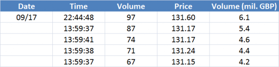 Největší obchody podle objemu na GBPUSD (aktivní future kontrakt):