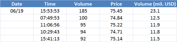 Největší obchody podle objemu na Brent (aktivní future kontrakt)