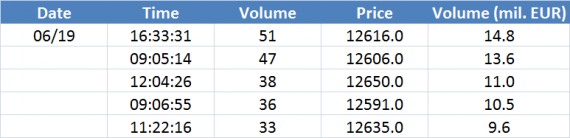 Největší obchody podle objemu na DAX (aktivní future kontrakt)