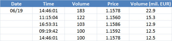 Největší obchody podle objemu na EURUSD (aktivní future kontrakt):