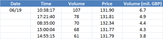 Největší obchody podle objemu na GBPUSD (aktivní future kontrakt):