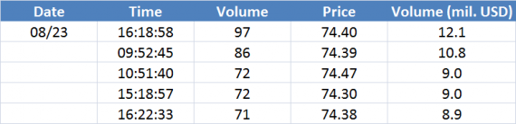 Největší obchody podle objemu na Brent (aktivní future kontrakt)
