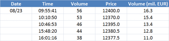 Největší obchody podle objemu na DAX (aktivní future kontrakt)