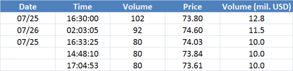 Největší obchody podle objemu na Brent (aktivní future kontrakt)