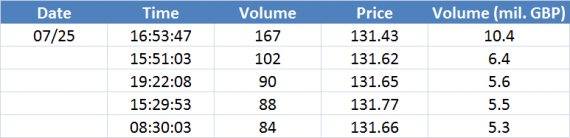 Největší obchody podle objemu na GBPUSD (aktivní future kontrakt):