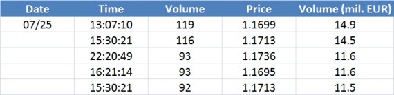Největší obchody podle objemu na EURUSD (aktivní future kontrakt):