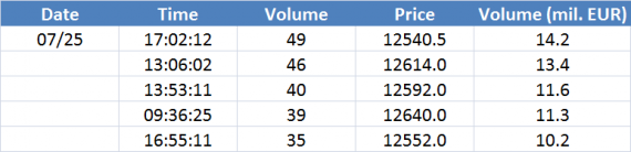 Největší obchody podle objemu na DAX (aktivní future kontrakt)