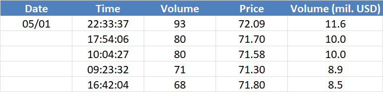 Největší obchody podle objemu na Brent (aktivní future kontrakt)