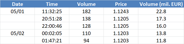 Největší obchody podle objemu na EURUSD (aktivní future kontrakt):