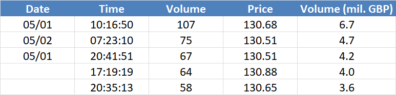 Největší obchody podle objemu na GBPUSD (aktivní future kontrakt): Největší denní objemy na trhu s měnovými futures. Na cenách, kde se včera objevily největší objemy, mohou být velcí hráči aktivní i dnes – zejména pokud se tyto ceny pohybují u některého ze včerejších high/low.