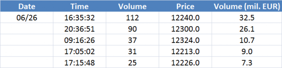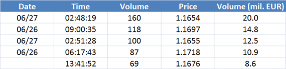 Největší obchody podle objemu na EURUSD (aktivní future kontrakt):