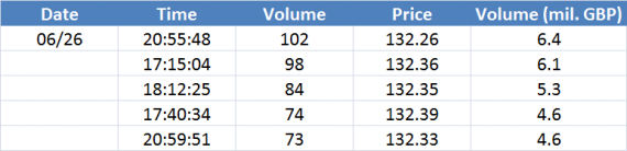 Největší obchody podle objemu na GBPUSD (aktivní future kontrakt):