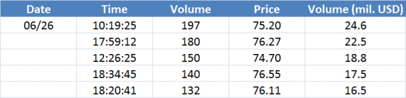 Největší obchody podle objemu na Brent (aktivní future kontrakt)