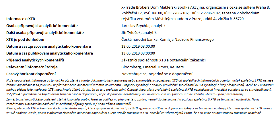 Rozdílové smlouvy jsou komplexní nástroje a v důsledku použití finanční páky jsou spojeny s vysokým rizikem rychlého vzniku finanční ztráty. U 71 % účtů retailových investorů došlo při obchodování s rozdílovými smlouvami u tohoto poskytovatele ke vzniku ztráty. Měli byste zvážit, zda rozumíte tomu, jak rozdílové smlouvy fungují, a zda si můžete dovolit vysoké riziko ztráty svých finančních prostředků. Investování je rizikové. Investujte zodpovědně. Tento materiál je marketingovou komunikací ve smyslu čl. 24 odst. 3 směrnice Evropského parlamentu a Rady 2014/65/EU ze dne 15. května 2014 o trzích finančních nástrojů, kterou se mění směrnice 2002/92/ES a směrnice 2011/61/EU (MiFID II). Marketingová komunikace není investiční doporučení ani informace doporučující či navrhující investiční strategii ve smyslu nařízení Evropského parlamentu a Rady (EU) č. 596/2014 ze dne 16. dubna 2014 o zneužívání trhu (nařízení o zneužívání trhu) a o zrušení směrnice Evropského parlamentu a Rady 2003/6/ES a směrnic Komise 2003/124/ES, 2003/125/ES a 2004/72/ES a nařízení Komise v přenesené pravomoci (EU) 2016/958 ze dne 9. března 2016, kterým se doplňuje nařízení Evropského parlamentu a Rady (EU) č. 596/2014, pokud jde o regulační technické normy pro technická ujednání pro objektivní předkládání investičních doporučení nebo jiných informací doporučujících nebo navrhujících investiční strategie a pro zveřejnění konkrétních zájmů nebo náznaků střetu zájmů nebo jakékoli jiné rady, a to i v oblasti investičního poradenství, ve smyslu zákona č. 256/2004 Sb., o podnikání na kapitálovém trhu. Marketingová komunikace je připravena s nejvyšší pečlivostí, objektivitou, prezentuje fakta známé autorovi k datu přípravy a neobsahuje žádné hodnotící prvky. Marketingová komunikace je připravena bez zohlednění potřeb klienta, jeho individuální finanční situace a nijak nepředstavuje investiční strategii. Marketingová komunikace nepředstavuje nabídku k prodeji, nabídku, předplatné, výzvu na nákup, reklamu nebo propagaci jakýchkoliv finančních nástrojů. Společnost XTB S.A., organizační složka nenese odpovědnost za jakékoli jednání nebo opomenutí klienta, zejména za získání nebo zcizení finančních nástrojů, na základě informací obsažených v této marketingové komunikaci. V případě, že marketingová komunikace obsahuje jakékoli informace o jakýchkoli výsledcích týkajících se finančních nástrojů v nich uvedených, nepředstavují žádnou záruku ani předpověď ohledně budoucích výsledků. Minulá výkonnost nemusí nutně vypovídat o budoucích výsledcích a každá osoba jednající na základě těchto informací tak činí zcela na vlastní riziko.