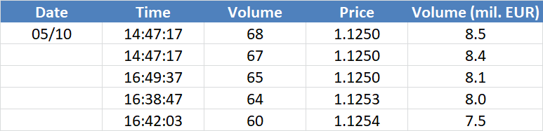 Největší obchody podle objemu na EURUSD (aktivní future kontrakt):
