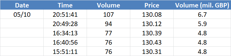 Největší obchody podle objemu na GBPUSD (aktivní future kontrakt): Největší denní objemy na trhu s měnovými futures. Na cenách, kde se včera objevily největší objemy, mohou být velcí hráči aktivní i dnes – zejména pokud se tyto ceny pohybují u některého ze včerejších high/low.