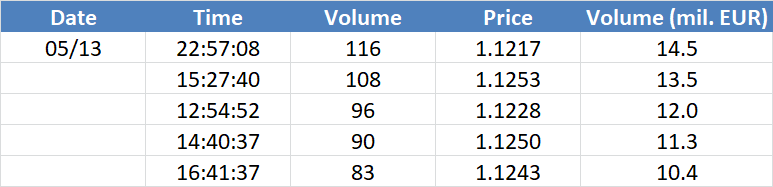 Největší obchody podle objemu na EURUSD (aktivní future kontrakt):