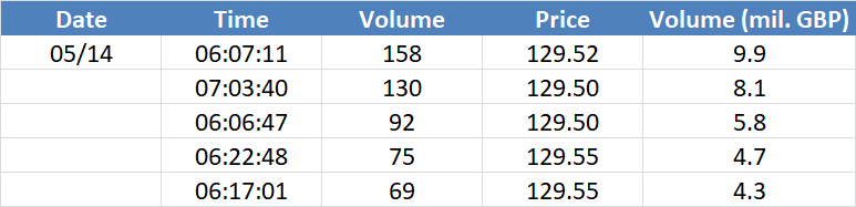 Největší obchody podle objemu na GBPUSD (aktivní future kontrakt): Největší denní objemy na trhu s měnovými futures. Na cenách, kde se včera objevily největší objemy, mohou být velcí hráči aktivní i dnes – zejména pokud se tyto ceny pohybují u některého ze včerejších high/low.